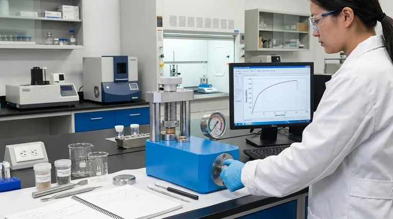 試験環境下の油圧プレスは、単なる強力な万力ではありません。特定の速度で特定の荷重を加えるように校正されており、センサーが材料の反応を測定します。これにより、サンプルの圧縮という物理的な動作が、その破壊点、弾性、変形特性を示す定量的なデータセットに変換されます。