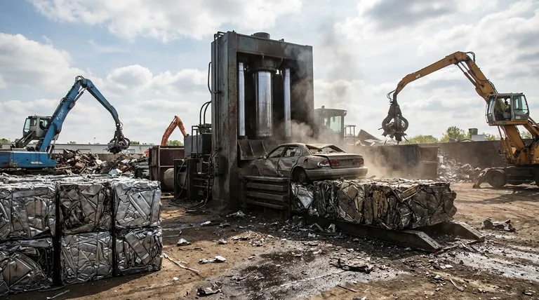 油圧プレスは、その核となる重要なリンクです。 は、かさばる使用済み自動車を管理可能な価値ある商品に変える重要なリンクです。巨大で集中した力を加えることで、これらの機械は自動車を高密度で均一なブロックに圧縮し、低密度の金属スクラップを効率的に移動させるという物流の根本的な問題を解決する。