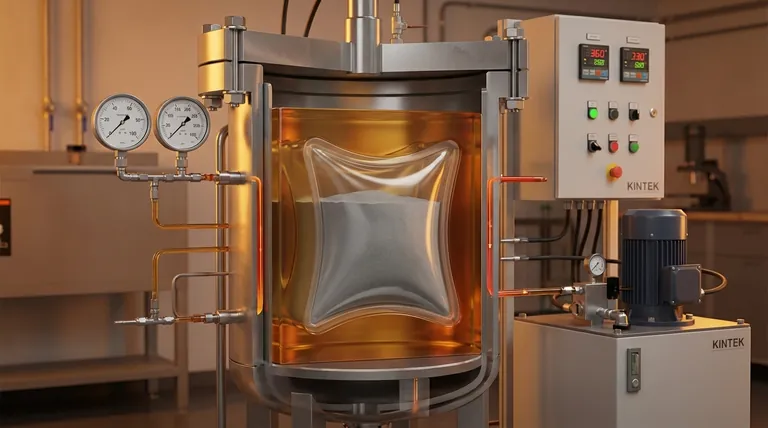 温間静水圧プレス(WIP)では、油圧が粉末を固体で均一な部品に固めるための基本的なメカニズムとして使用されます。特殊な油や水などの加熱された液体が密閉された圧力容器に送り込まれ、そこで粉末を入れた柔軟な金型を包み込みます。この流体は、あらゆる方向から均等かつ同時に力を伝達し、「静水圧」と呼ばれる圧力を生成して、材料を非常に高い一貫性で圧縮します。