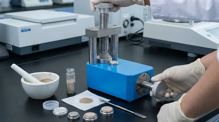 これは正確な定量分析のための最も一般的な方法です。サンプルはまず非常に細かい粉末(通常75ミクロン未満)に粉砕され、その後、油圧プレスを使用して高圧(15〜20トン)でプレスされます。